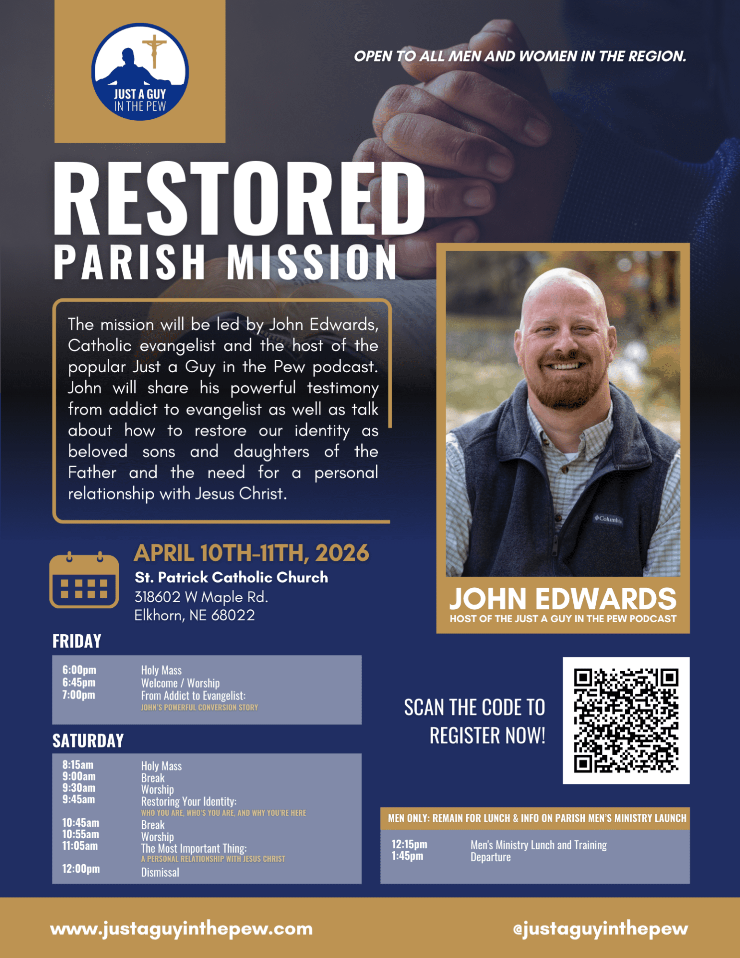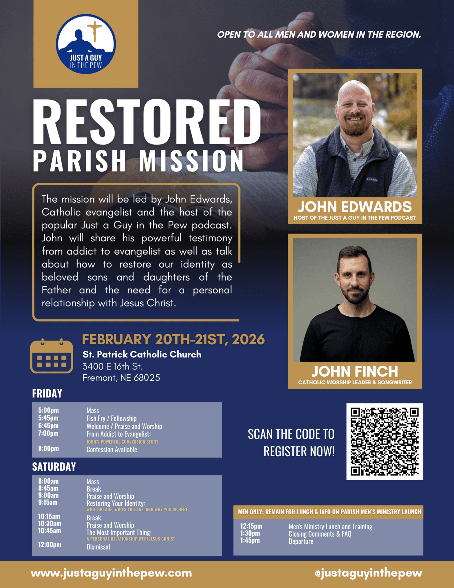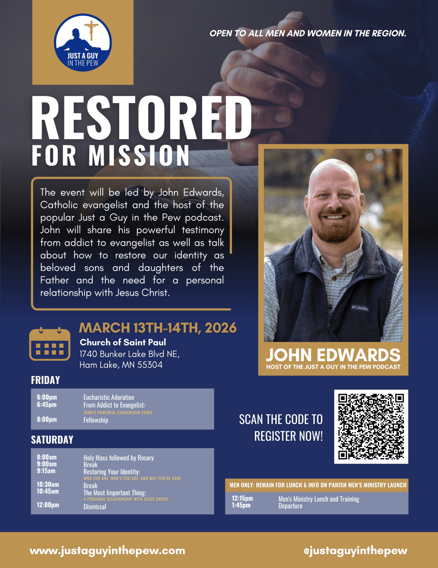 John will be visiting St Justin Martyr, Sunset Hills, MO for a “RESTORED” Parish Mission and mens group launch! He will share his powerful testimony and give 3 talks (for men AND women) that invite those in attendance to healing and restoration. He will then host a Men’s Group Leadership Training to discuss the Four […]