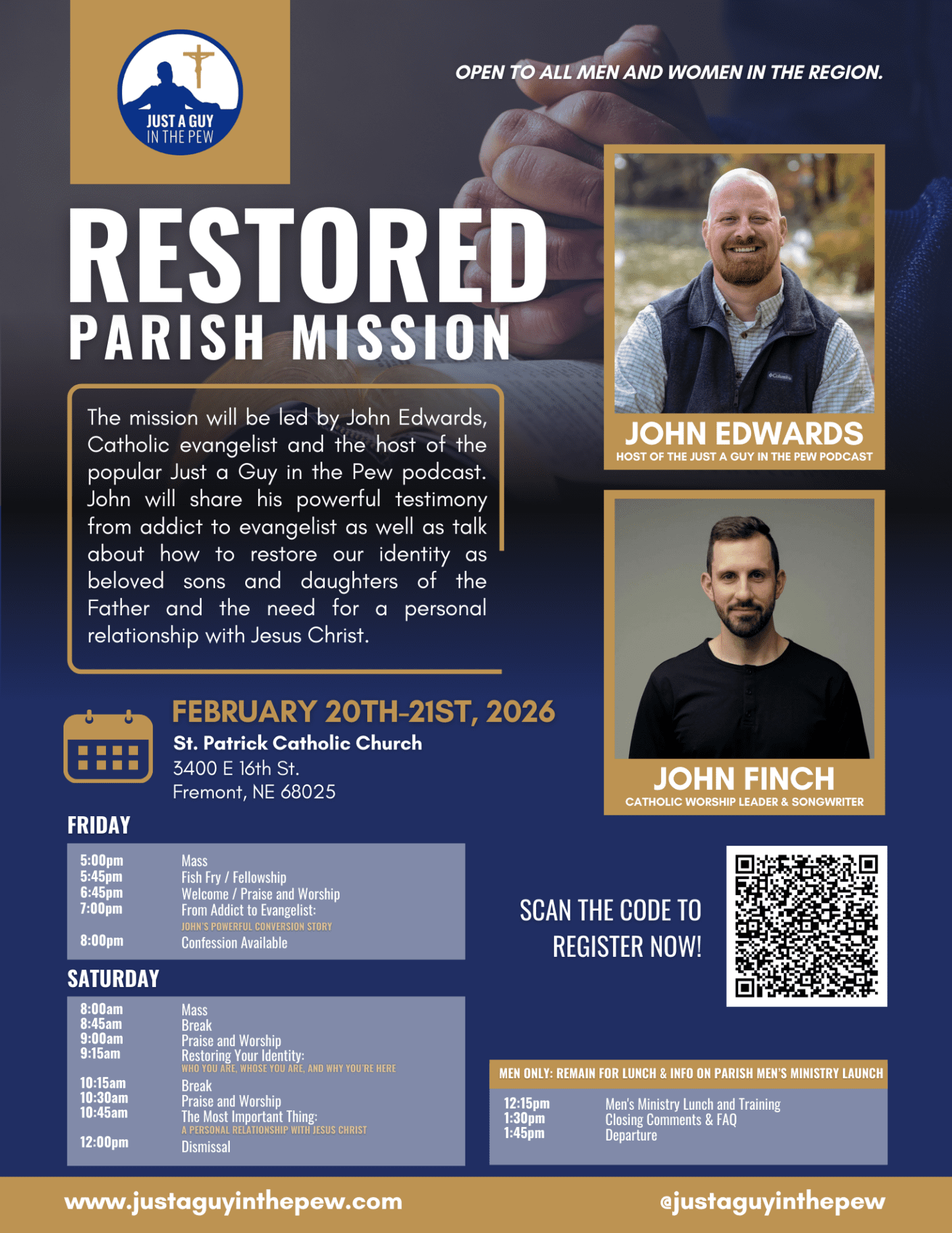 John will be visiting St Patrick's Catholic Church, Fremont, NE for a “RESTORED” Parish Mission and mens group launch! He will share his powerful testimony and give 3 talks (for […]