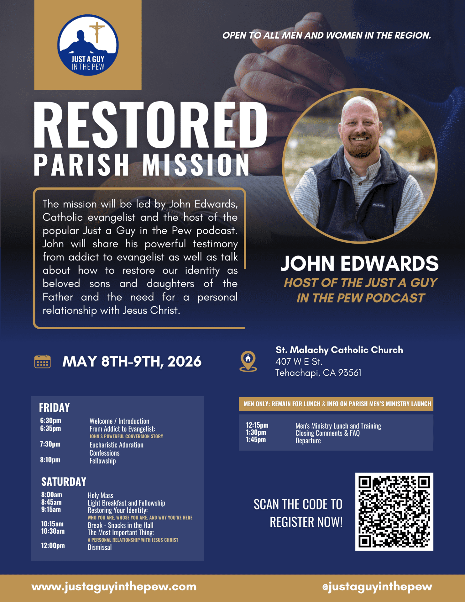 John will be visiting St. Malachy Roman Catholic Church in Tehachapi, CA for a “RESTORED” Parish Mission and mens group launch! He will share his powerful testimony and give 3 […]